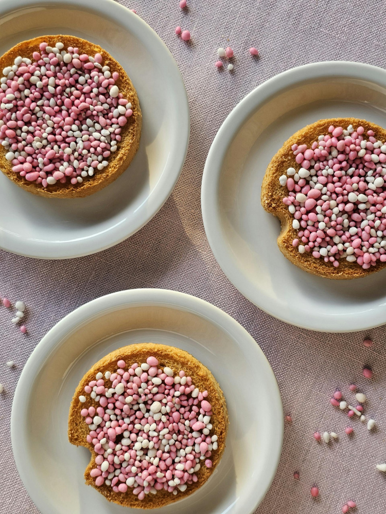 Muisjes serpin: Tereyağı sürülmüş beschuit'lerin üzerine bolca muisjes serpin. Şekerlemeler yüzeyi kaplayacak şekilde eşit dağıtılmalı.